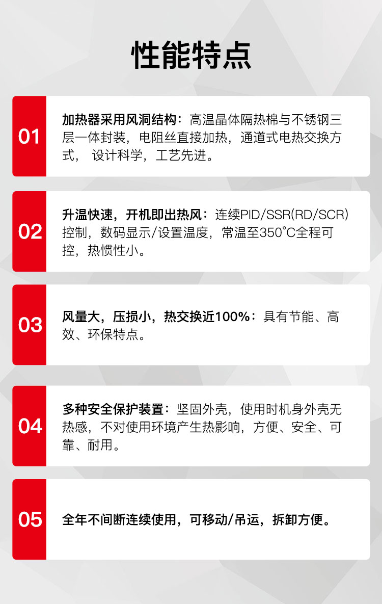 ③熱風(fēng)在出口溫度為200°C時,發(fā)熱絲表面溫度僅350°C而已,這種熱交換率讓本產(chǎn)品達(dá)到其它加熱器無法達(dá)到的要求。