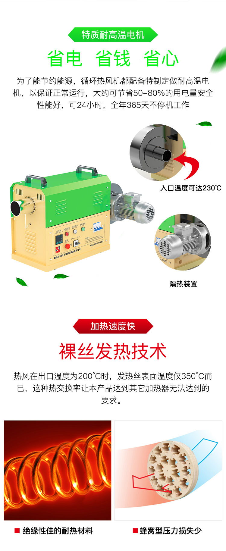 ④為了節(jié)約能源,循環(huán)型系列熱風(fēng)機都配備特制定做耐高溫電機,以保證正常運行,大約可節(jié)省50-80%的用電量。