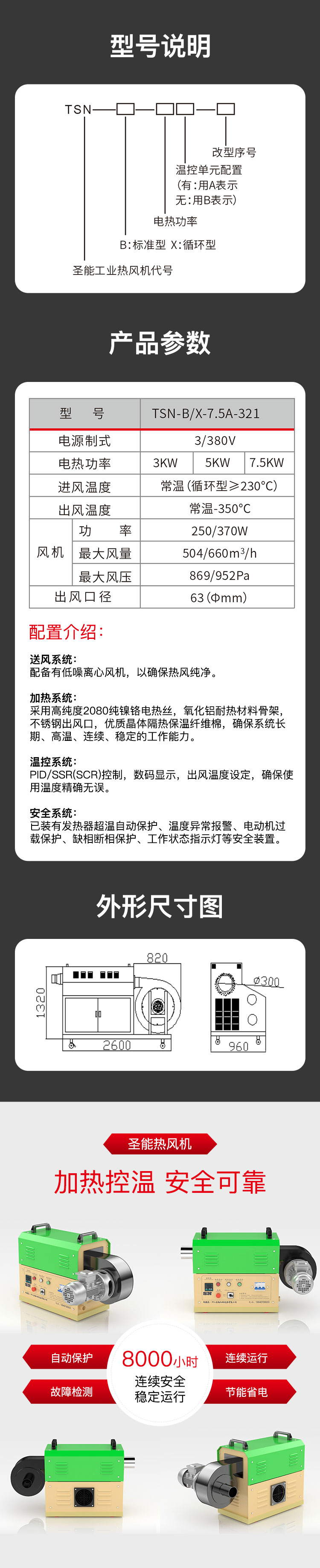 “TSN”工業(yè)熱風(fēng)機主要由送風(fēng)系統(tǒng)、加熱系統(tǒng)、溫控系統(tǒng)三大部分部分組成。通電后,鼓風(fēng)機把空氣吹送到加熱器里,令空氣從螺旋狀的電熱絲內(nèi)、外側(cè)均勻通過,電熱絲通電后產(chǎn)生的熱量與通過的冷空氣進(jìn)行熱交換,從而使出風(fēng)口的風(fēng)溫升高。出風(fēng)口處的K型熱電偶及時將探測到的出風(fēng)溫度反饋到溫控儀,儀表根據(jù)設(shè)定的溫度檢測著工作的實際溫度,并將有關(guān)信息傳遞回固態(tài)繼電器進(jìn)而控制加熱器是否工作。同時,鼓風(fēng)機可利用風(fēng)量調(diào)節(jié)器(變頻器、手動)調(diào)節(jié)吹送空氣的風(fēng)量大小。另外,送風(fēng)系統(tǒng)及加熱器,均有過載超溫自動保護(hù)裝置,總電路也設(shè)計了緊急摯,以保證安全,防止錯誤操作。